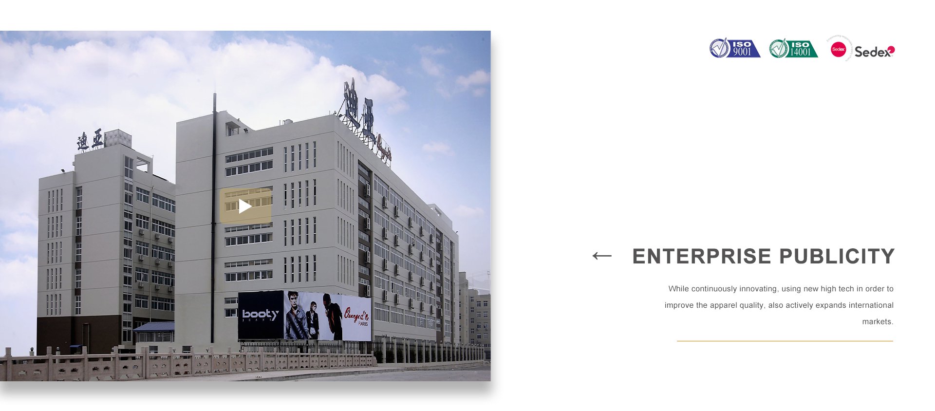 浙江迪亞服飾有限公司于1998年在世界時尚品牌之都——法國巴黎二區(qū)應(yīng)運而生。同年,在浙江省甌海經(jīng)濟開發(fā)區(qū)東方南路28號設(shè)立服裝制造工廠。公司集服裝設(shè)計、生產(chǎn)、營銷、品牌于一體,在不斷創(chuàng)新、采用高新技術(shù)提高服飾質(zhì)量的同時,積極拓展國際市場,海外營銷部長期與LV集團旗下的MAJE、SOEUR、BALIBARIS等國際著名品牌保持非常緊密的合作關(guān)系。品牌建設(shè)是公司堅持不懈的追求,我們每年都會積極參加國內(nèi)外舉辦的各大服裝展銷會。憑借著良好的質(zhì)量與信譽,市場占有率在逐漸擴大,產(chǎn)品遠銷歐洲、美洲、亞洲等國。公司以生產(chǎn)棉衣、羽絨服、派克、大衣、夾克、運動休閑服飾等為主,旗下主打品牌有 ORANGE D’OR 、CLAIRVAL、BOOTY JEANS 、S&V和SASAEC,各品牌服飾均以典雅的色彩、優(yōu)美的線條、卓越的魅力吸引著都市麗人,將時尚、經(jīng)典的潮流信息予以淋漓盡致的演繹。